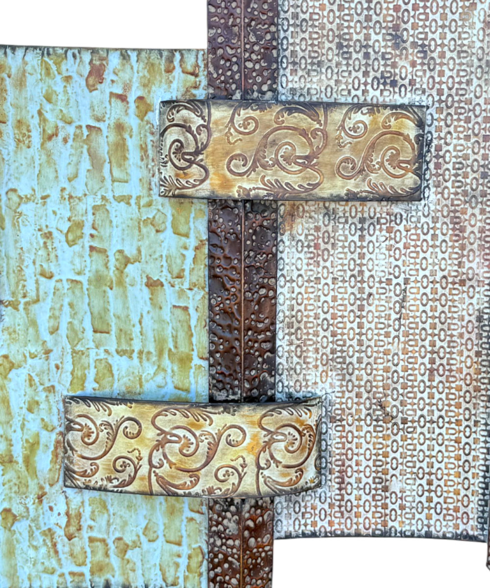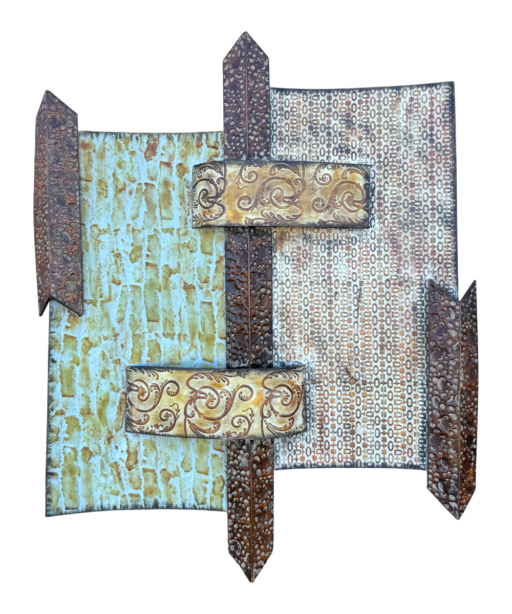 El diseño presenta una combinación de tonos metálicos envejecidos, con matices en ocres, marrones y azulados que generan contraste y riqueza visual. Los detalles en relieve y las superficies texturizadas aportan dimensión y movimiento, haciendo que la pieza se perciba distinta según la luz y el ángulo desde el que se observe. Su estética lo convierte en un complemento ideal tanto para espacios modernos como para ambientes más clásicos o eclécticos.