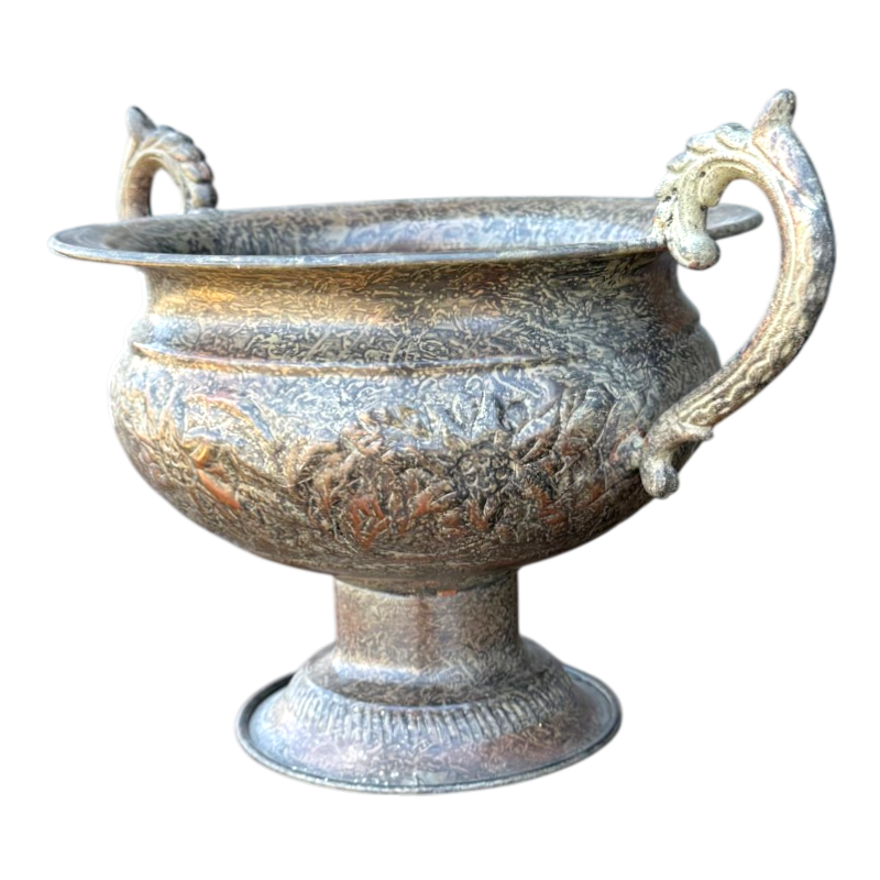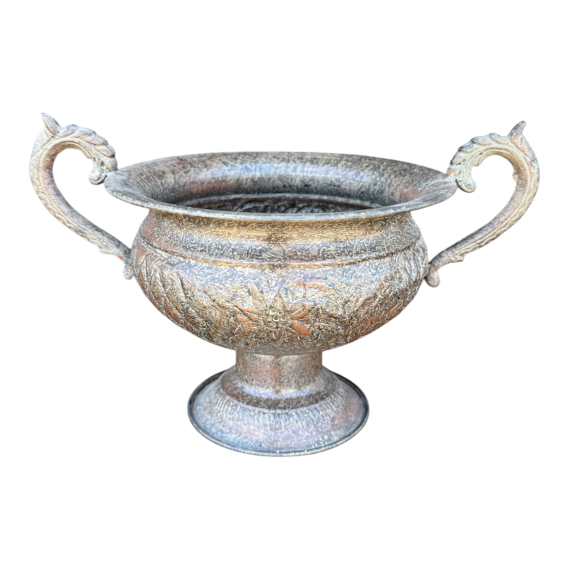 Este elegante centro de mesa decorativo metálico es una pieza que destaca por su estilo clásico y su gran presencia visual. Su diseño ornamental y sus detalles grabados lo convierten en un accesorio ideal para aportar carácter y sofisticación a distintos ambientes del hogar.