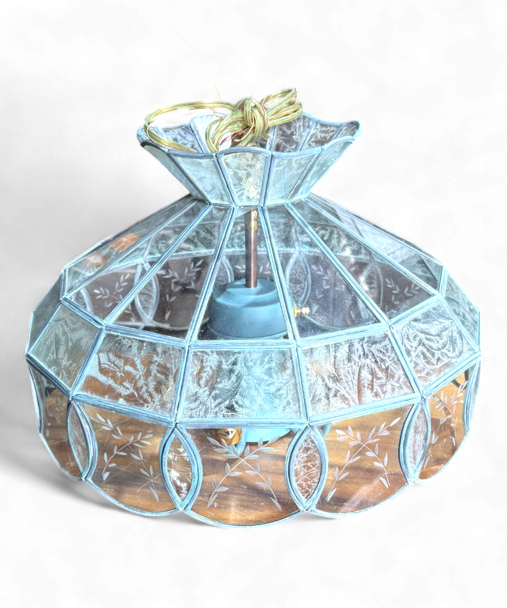 Encantadora lámpara de techo estilo vintage, fabricada en vidrio tallado con diseños florales y estructura metálica azulada. Su diseño facetado y forma abombada reflejan la luz de manera elegante, creando un ambiente cálido y decorativo.